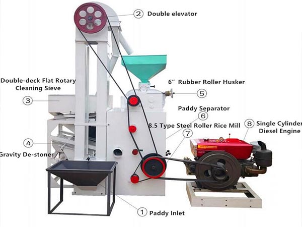 WT-15/8.5SR combined rice mill with diesel engine contains horizontal cleaning sieve, blow type de-stoner, rubber roller husker,steel roller rice mill, and double elevator.